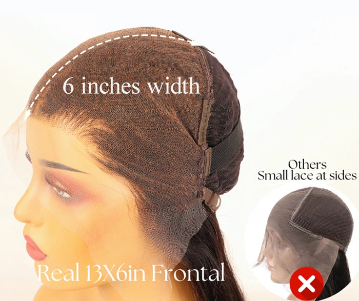 13x6 Lace Front: This indicates the size of the lace frontal on the wig. In this case, it's 13 inches from ear to ear, and 6 inches from the hairline back. The larger front lace size allows for a natural-looking hairline and the illusion that hair is growing directly from the scalp.